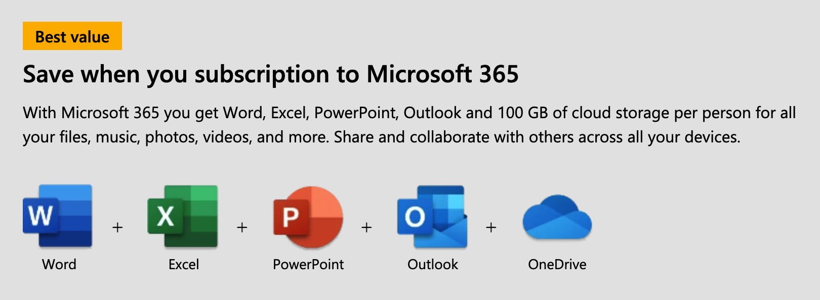 Your Microsoft 365 Personal account with up to 5 devices. Take advantage of premium Office apps, 100 GB cloud storage, and advanced security features for email and files.